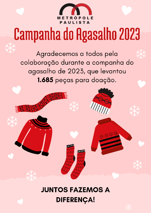 A Campanha do agasalho 2023 foi realizada de 15/05/2023 a 15/06/2023 e arrecadou 1.685 peças para doação às instituições que apoiam pessoas em situação de